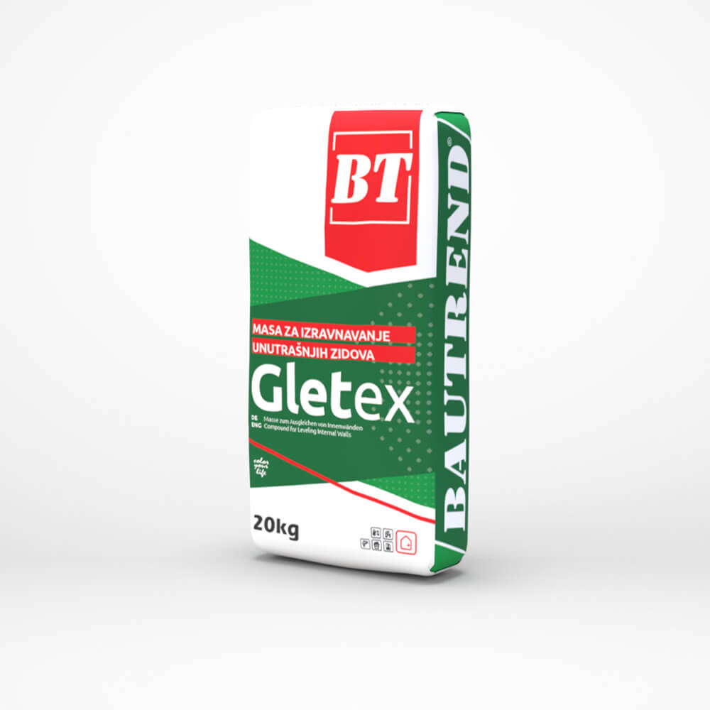 BT-Gletex ist eine Spachtelmasse, die zum Spachteln von Innenwänden aus Putz und Beton vorgesehen ist. Sie wird zum Egalisieren größerer Wand- oder Deckenflächen sowie zum Ausfüllen kleinerer Vertiefungen, Risse, Löcher und zur Ausbesserung anderer Unebenheiten oder Beschädigungen verwendet. Sie weist eine gute Haftung auf Kalk-, Kalk-Zement-, feinen Zementputzen, Gipskartonplatten und Betonoberflächen auf.